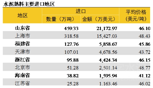 从进口熟料的区域来看,山东占总进口量的36%,位于长三角区域的上海、浙江、江苏合计占35%,华南福建、海南两省合计占13%。