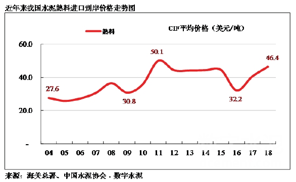 从我国海关总署的贸易额来看,进口水泥熟料价格从2016年开始已经连续三年走高,2018年平均的进口到岸价达到46.4美金,从2018年的月度分析来看,3月份最低40美金,12月份最高达到50美金。